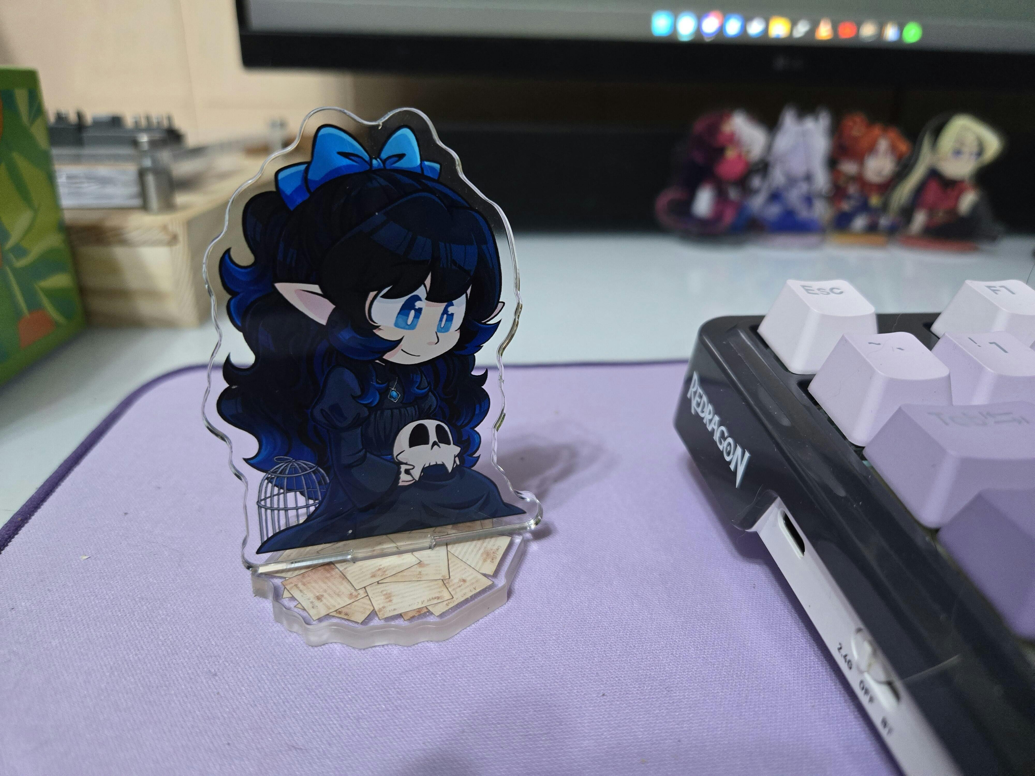 Acrylic standee featuring the soft but anxious bard Lapis (and vampire lord Dave)! Bring home your favorite elf and her skeletal best friend to display in your home- on a shelf, on a desk, anywhere you like!